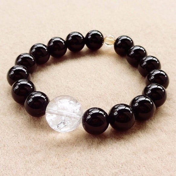 モリオンだけを用いたブレスレットも検討したのですがあまりに強烈過ぎるため、水晶の中で最強を誇るといわれるヒマラヤ水晶(14mm)をワンポイントに用いて、クセをできるだけなくしています。ですので、パワーストーンに慣れていない方でも気軽に身に着けていたただくことができるはずです。
